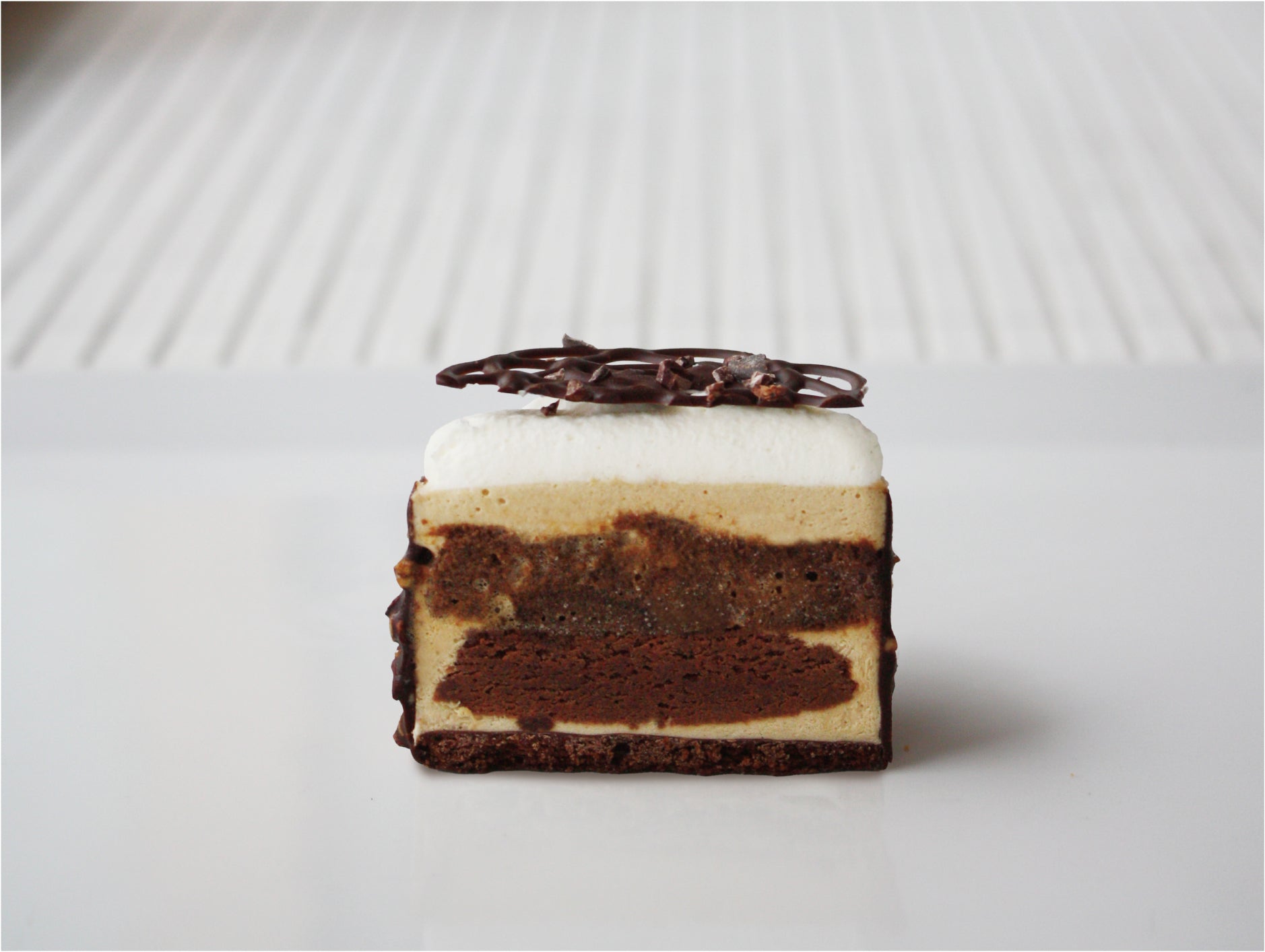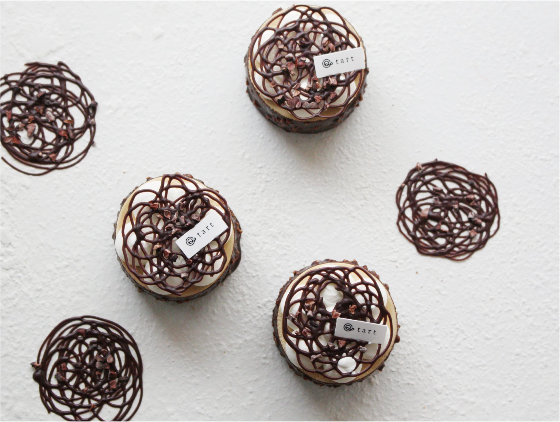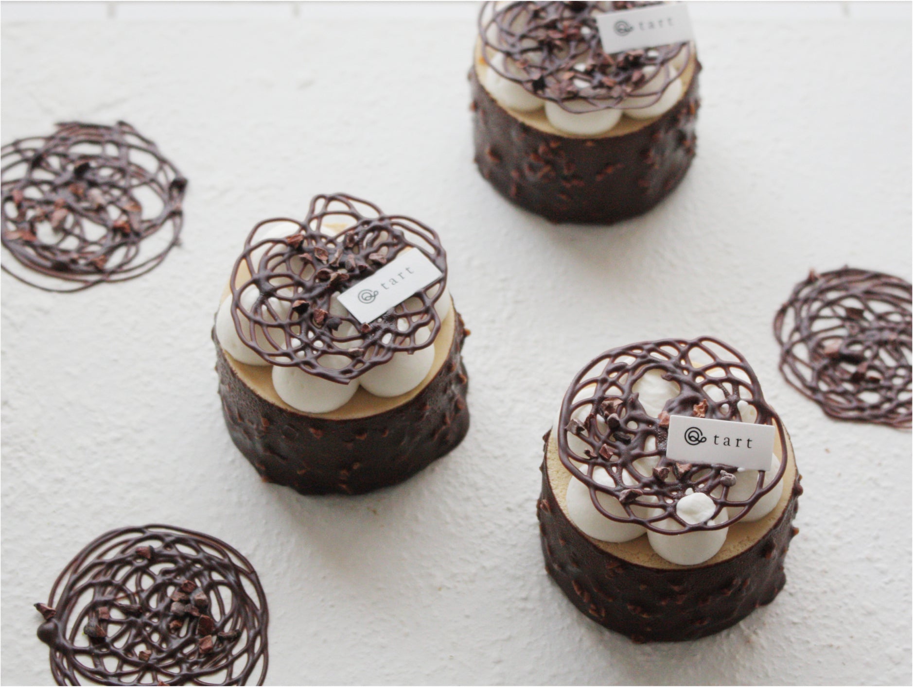コーヒーシロップをしみ込ませたダクワー ズと濃厚なチョコレートケーキを組み合わせた、リッチな味わいのタルトです。香ばしいカカオニブとヘーゼルナッツがアクセントです。
